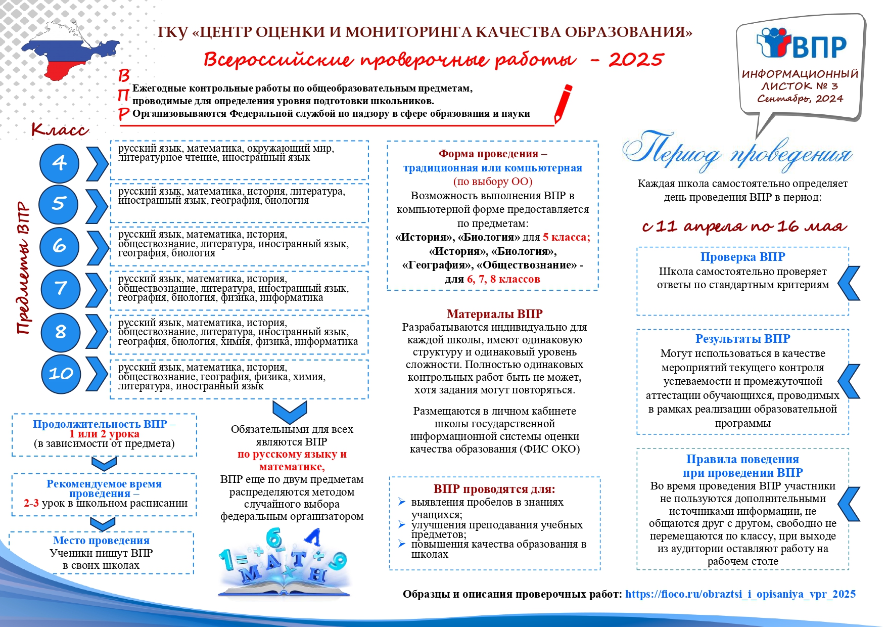 Рособрнадзор проинформировал, что ВПР будут проводиться в период с 11 апреля по 16 мая 2025 года в 4, 5, 6, 7, 8, 10 классах на бумажном носители или в компьютерном формате по образцам и описаниям контрольно-измерительных материалов 2023 года, которые представлены на сайте ФГБУ «Федеральный институт оценки качества образования» (ФИОКО) и в нашем материале.